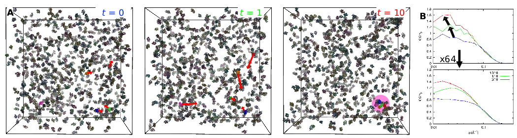 FMAPIq uses MAEPPI (many-protein atomistic energy from precomputed pair interaction) to drive Monte Carlo simulations of dense protein solutions and uses Sim2Iq to calculate small-angle scattering profiles, I(q). In MAEPPI, we first precompute the interaction energies of a protein pair at various relative displacements and relative orientations, and store them in a lookup table. In simulations of a many-protein system, we then obtain the total energy by looking up and adding up the interaction energies of individual protein pairs. The fast calculation of protein pair energies was made possible by using the FMAP method, which is based on fast Fourier transform (FFT). Likewise, Sim2Iq calculations are sped up by applying FFT to simulation snapshots. FMAPIq maintains atomic-level accuracy while achieving the speed of Lennard-Jones particles.